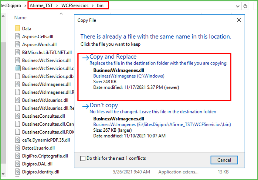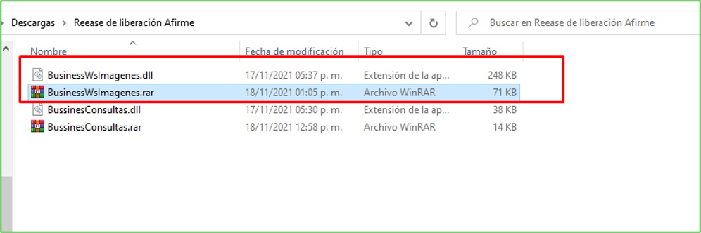 Aquí vamos a reemplazar las dll´s de nuestro paquete de liberación, en este caso si deberán ser las dos “BusinessWsImagenes.dll” y “BussinesConsultas.dll”.