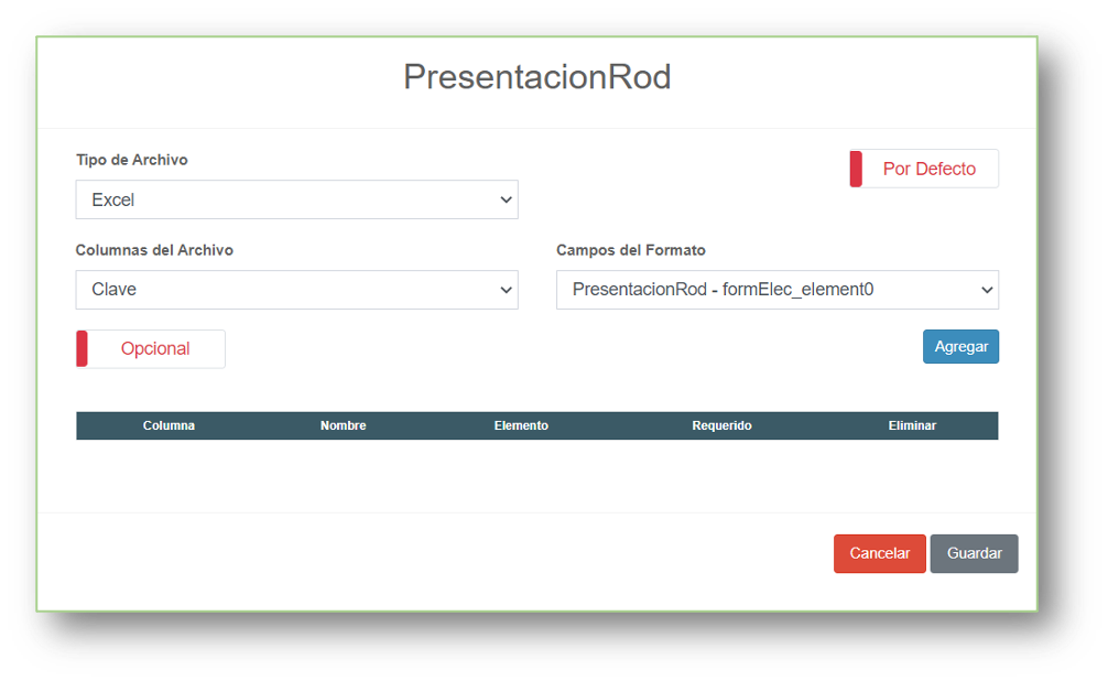 • Botón agregar: Al seleccionar la columna del archivo y campos del formato, al dar clic se agregarán esos datos a la configuración.