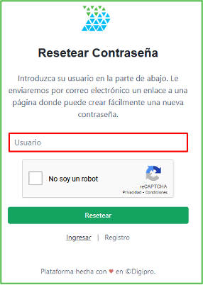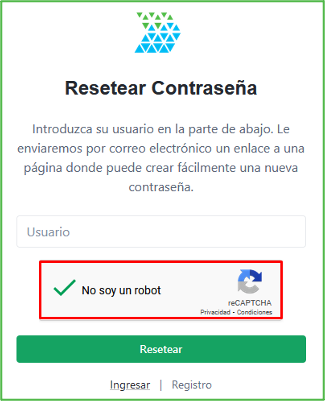El sistema nos redirige la pantalla de recuperación de contraseña, en el campo “Usuario” se escribe el usuario que desea recuperar la contraseña