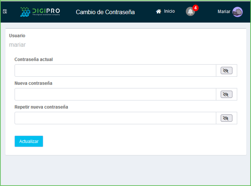 En el campo contraseña actual, se coloca la contraseña provisional que se asigno en el correo electrónico.