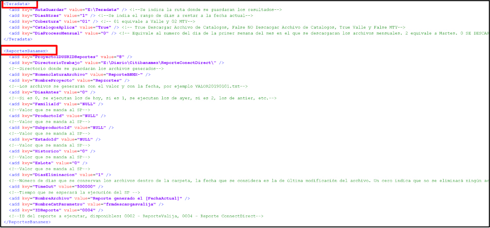 En este ejemplo conoceremos la configuración de Servicio de Teradata, dirigirse a la ruta donde fue guardada la instalación del aplicativo, la ruta deberá ser: C:\Program Files (x86)\DigiPro, S.A. de C.V\ServiciosCitibanamex\Teradata\. Abra el archivo SchedulerServices.exe.config con el bloc de notas para configurar la aplicación: