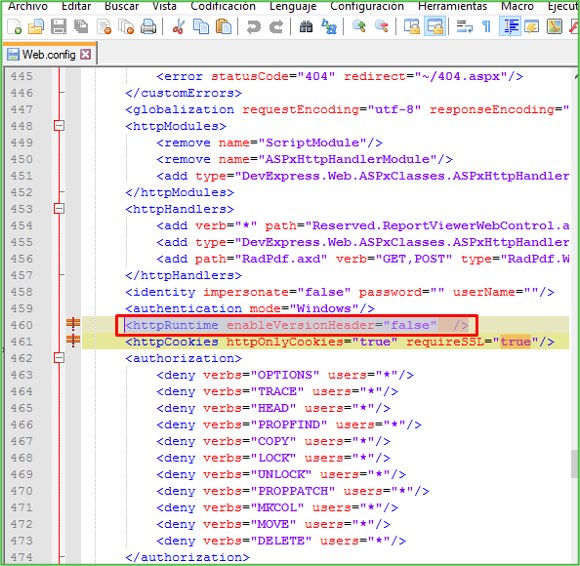 Como siguiente punto buscaremos la opción “httpRuntime” esto para evitar la divulgación de la versión ASP.NET