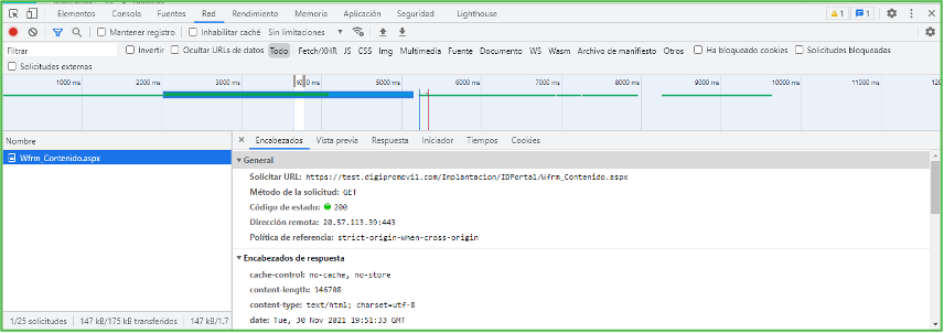 Para corroborar esto podremos validarlo dando clic a la tecla fn+f12 nos mostrara la siguiente ventana y nos posicionaremos en la opción de red dentro nos mostrara los Headers.