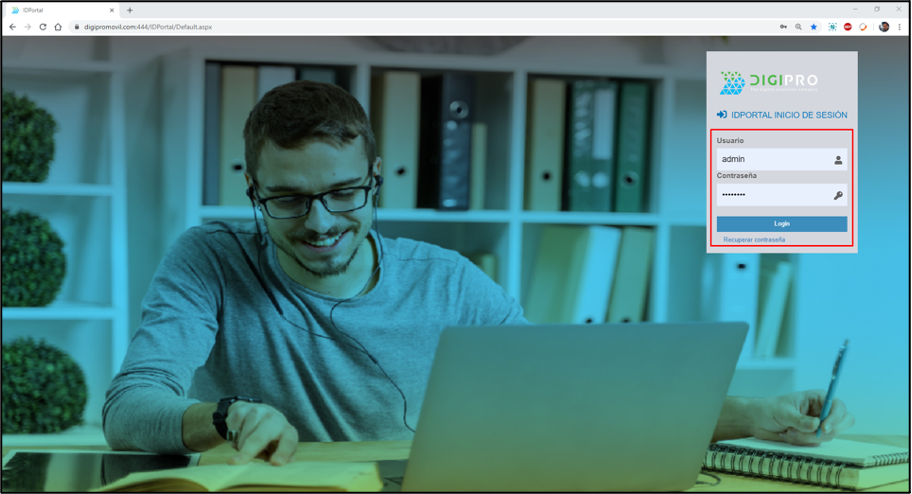 Para visualizar la página de acceso del sistema, hay que escribir la dirección correspondiente del portal en la barra de direcciones de Internet Explorer e ingresar los datos solicitados: