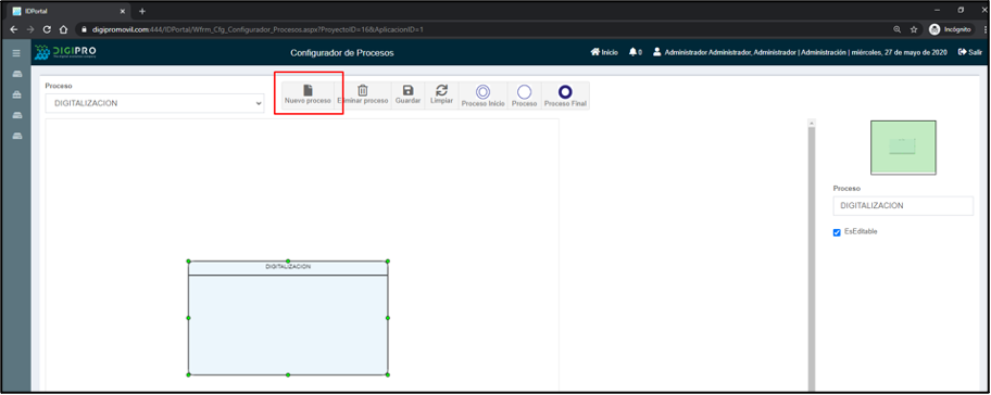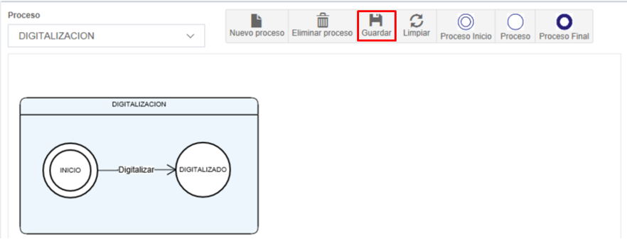 Damos en la opción “Guardar” y nos queda como resultado el proceso “DIGITALIZACION” creado exitosamente.