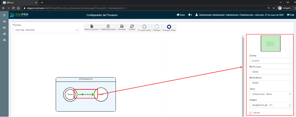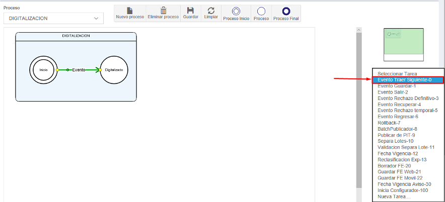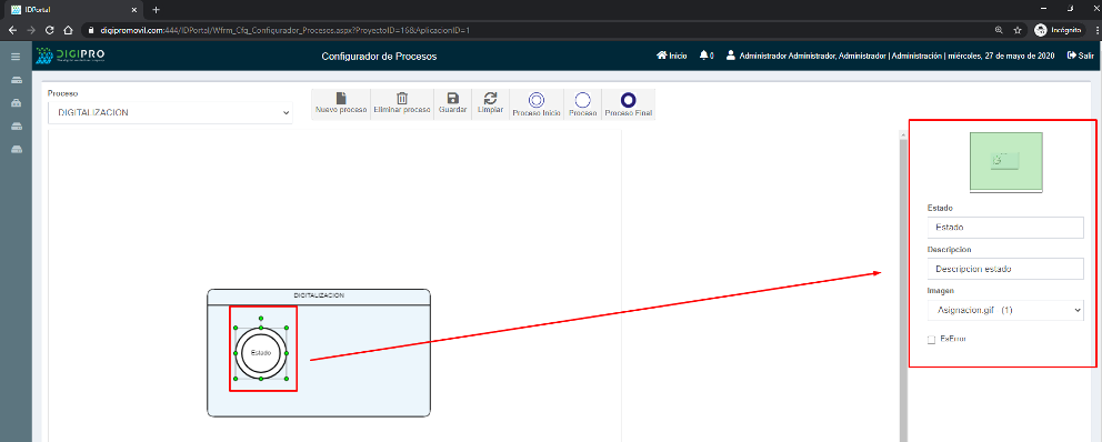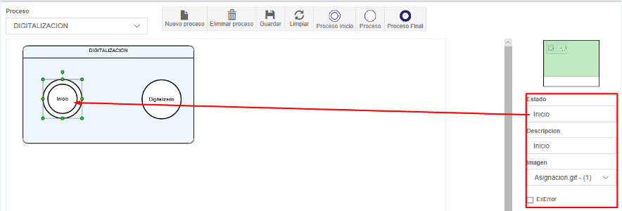 Solo se agregará el estado “Proceso final” para terminar o cancelar con la digitalización, lo arrastramos al proceso y le cambiamos el nombre