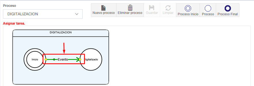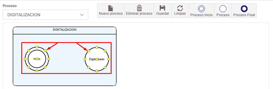 Para iniciar el proceso principal utilizaremos el estado de “Proceso inicio” arrastrándolo al recuadro (únicamente en este proceso de DIGITALIZACION) y posteriormente cerraremos con un estado “Proceso” normal, quedando de esta manera: