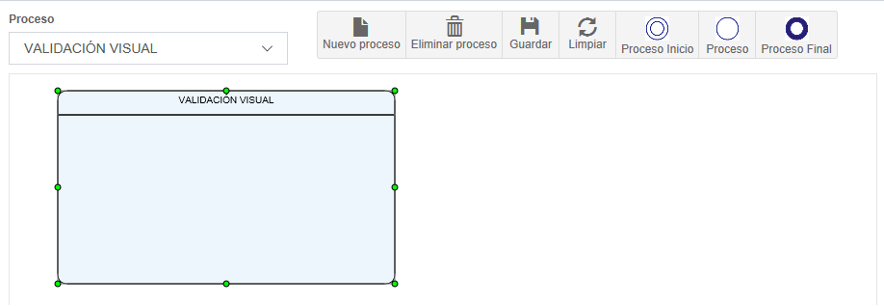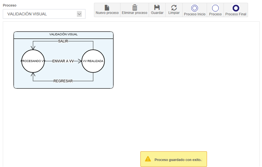 Damos en la opción “Guardar” y nos queda como resultado el proceso “VALIDACION VISUAL” creado exitosamente con su mensaje de confirmación.