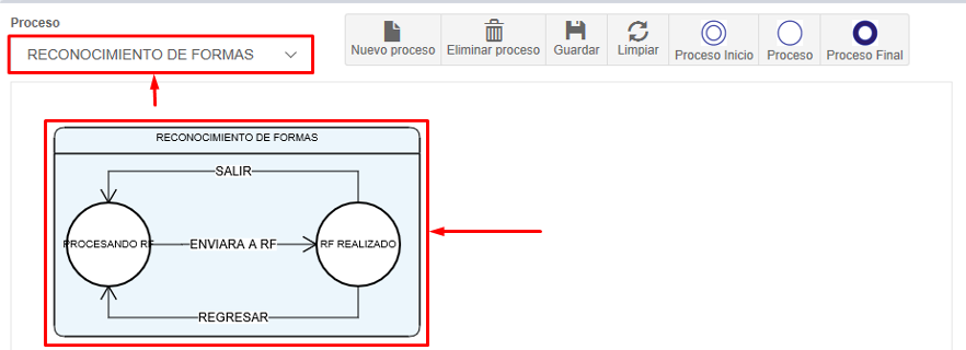 Seleccionamos el proceso de “RECONOCIMIENTO DE FORMAS”, agregamos los estados, le cambiamos los nombres, se agregan los eventos con las mismas tareas que ejecutan el proceso anterior “Evento Traer Siguiente-0 – Salir-2 – Rollback-7” y nos queda lo siguiente.