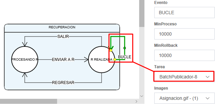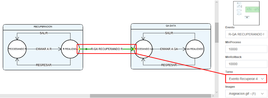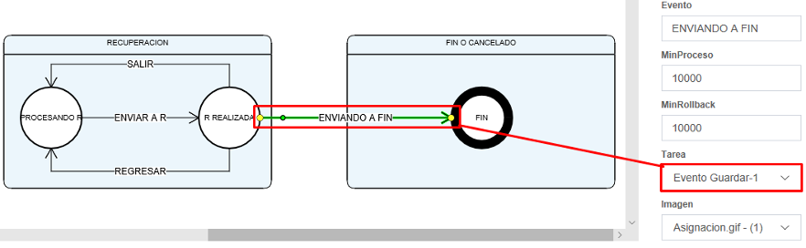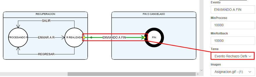 Creamos otro evento entre los mismos estados con la tarea “Rollback-7” y con el nombre “REGRESAR” para hacer la acción de regresar al estado “PROCESANDO VV”.