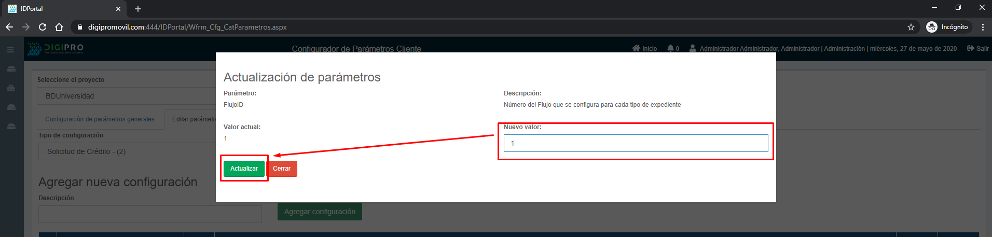 – En el campo “Nuevo Valor” ingrese el “Valor” que pertenece al flujo creado en “Configurador de Flujos” ejemplo: “3”