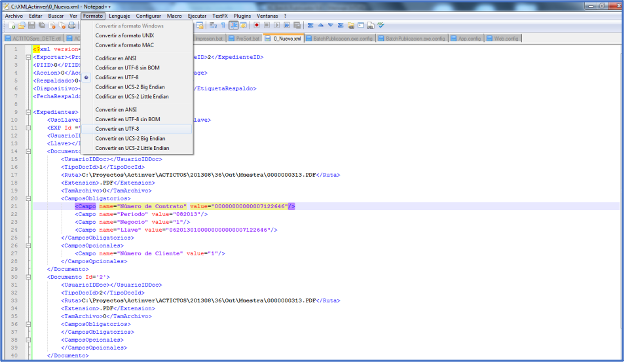 - El nombre del metadato contiene algun acento, para esto modifique la codificación del XML de ANSI a UFT-8, como se muestra a continuación.