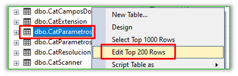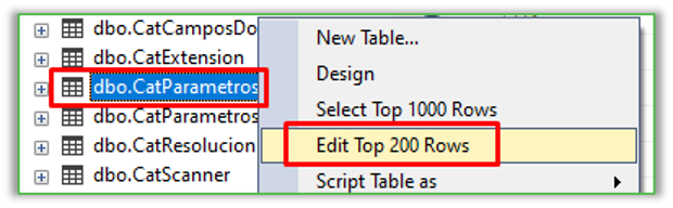 Se necesita tener acceso a la base de datos en este caso nosotros accedemos a ella mediante el programa SSMS (SQL Server Management Studio), nuestra tabla se encuentra dentro de la base PROMO, buscaremos la sección de tablas y en la tabla de “CatParametros” daremos clic derecho y seleccionaremos “Edit Top 200 Rows”.