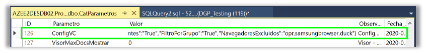 Se nos mostrará la siguiente tabla con todos los registros, nosotros buscaremos en la columna de “Parámetros” el registro llamado “ConfigVC”.