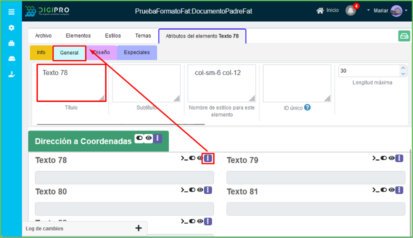 Entramos a los Atributos del Elemento del elemento “Texto lineal”, nos dirigimos a la pestaña “General” y en el campo de texto “Titulo” cambiamos el nombre de los elementos: