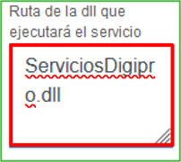 En la sección “Ruta de la dll que ejecutará el servicio” agregamos el valor del assemblypath del JSON “ServiciosDigipro.dll”