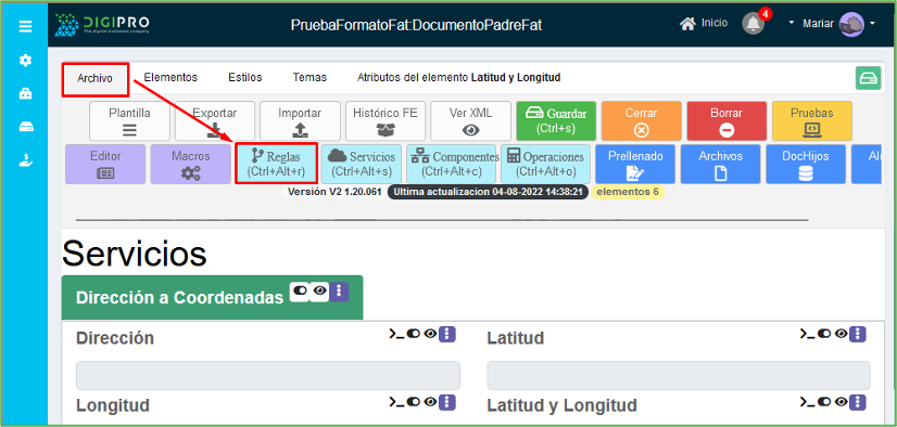 Como último paso vamos a añadir la regla que ejecutará el servicio de “Dirección a Coordenadas”, nos dirigimos a la pestaña “Archivo” y damos clic en el botón “Reglas”.