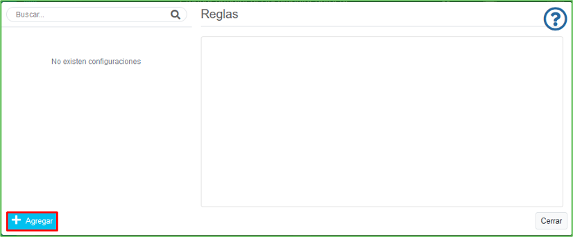 El configurador nos muestra el modal “Reglas”, para agregar la regla damos clic en el botón “Agregar”.