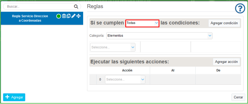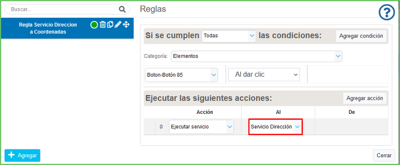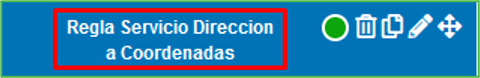La regla se agrega en la parte izquierda del modal, damos clic en el icono y cambiamos el nombre de la regla a “Regla Servicio Dirección a Coordenadas”.