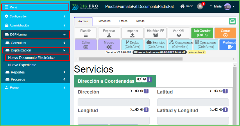 El presente manual ofrece una guía para la configuración del servicio “Dirección a Coordenadas” de forma básica con un ejemplo simple en el Formato Electrónico. La complejidad de las configuraciones dependerá del usuario final.