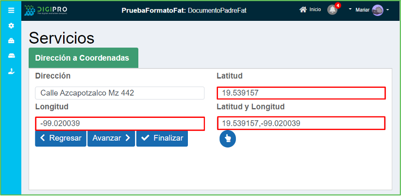 - Ejecutar el servicio de “Dirección a Coordenadas”