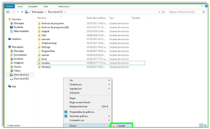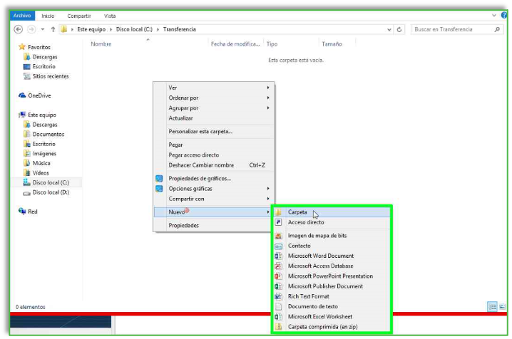 Nos dirigimos a la unidad C: del equipo, damos clic derecho sobre un espacio en blanco, seleccionamos Nuevo-Carpeta, la cual vamos a llamarla “Transferencia”.