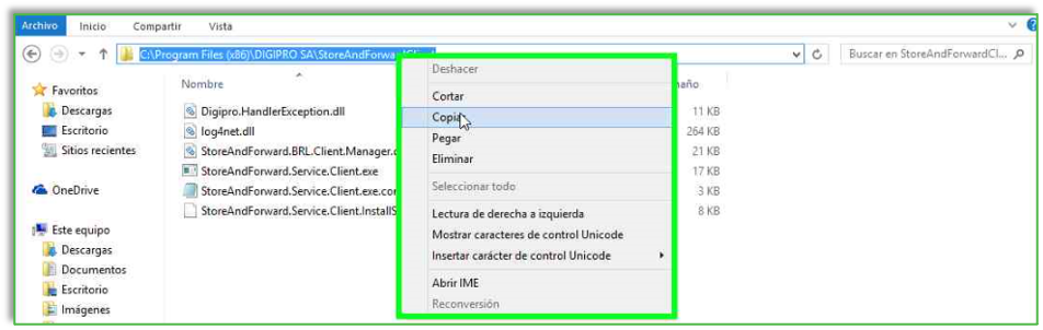 Inmediatamente después nos direccionamos a la carpeta que creamos en la unidad “C:\Program Files (x86)\DigiPro, S.A. de C.V\StoreAndForwardClient\”