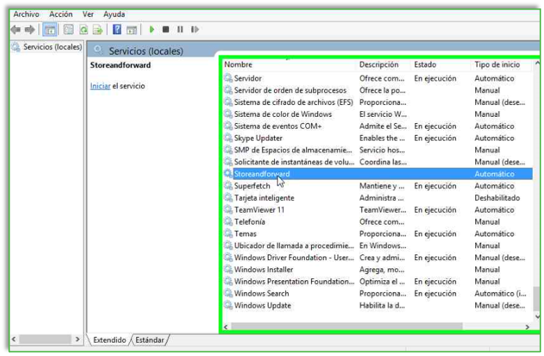 Al dar clic sobre “servicios locales” nos mostrara una ventana con un listado de diferentes servicios del sistema, por lo que únicamente buscaremos el servicio denominado “Storeandforward”