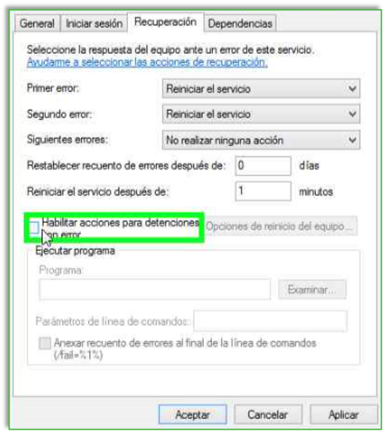 Habilitamos la casilla “Habilitar acciones para detenciones con error”. Damos Clic en “Aplicar”