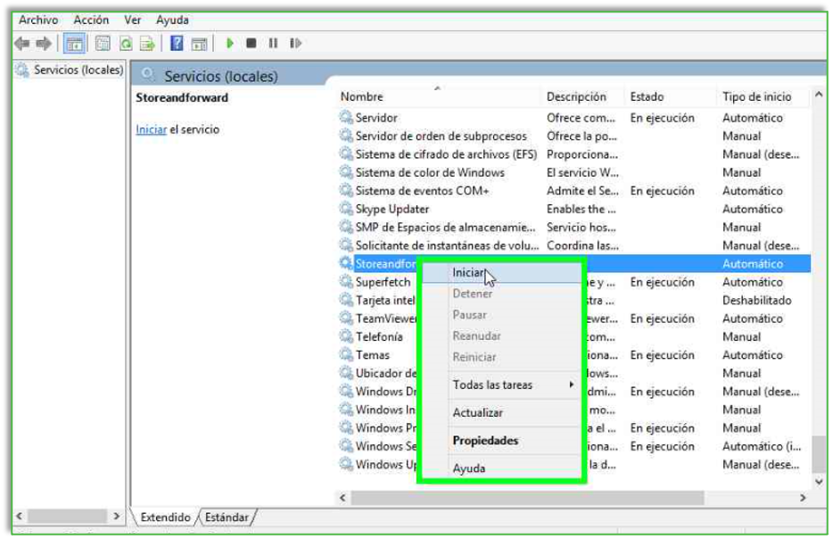 Ahora regresamos a la ventana de servicios nuevamente, damos clic derecho sobre el servicio del Storeandforward y seleccionamos “Iniciar”