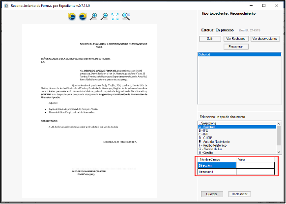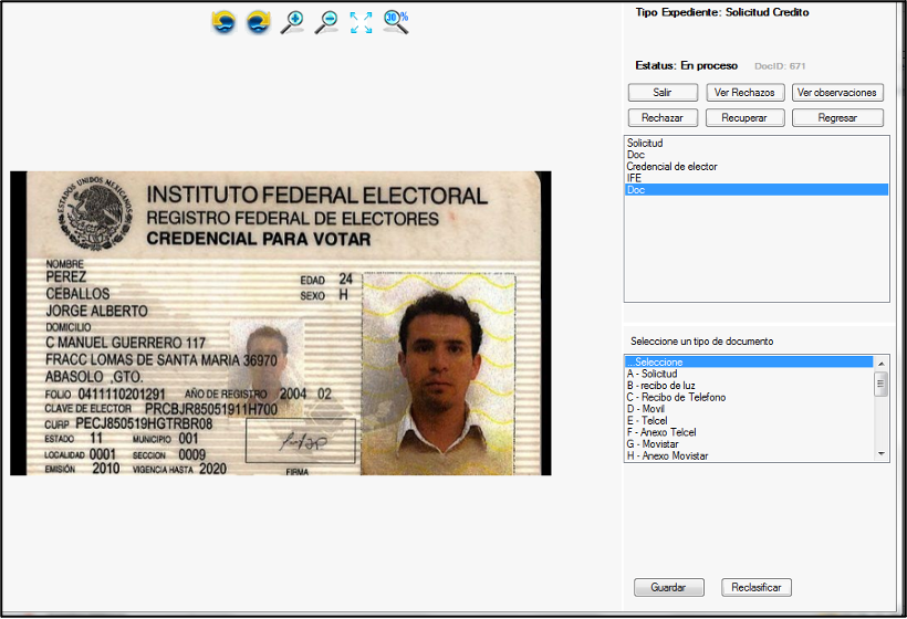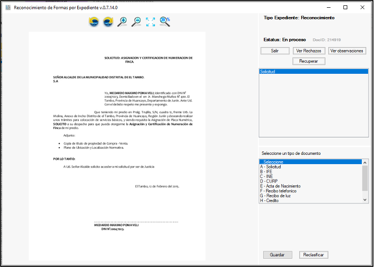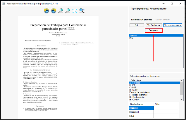 Al entrar a la pantalla de Reconocimiento de Formas el sistema automáticamente muestra los documentos que conforman el expediente, se posiciona en el primer documento de la lista mostrando la imagen.