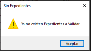En caso de no existir algún expediente en estado Digitalizado dentro del flujo del tracking, el sistema enviará un mensaje informando al usuario que no existen expedientes para realizar la clasificación de documentos, al dar clic en el botón ACEPTAR del mensaje automáticamente se cerrará la aplicación de Reconocimiento de Formas.