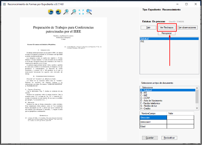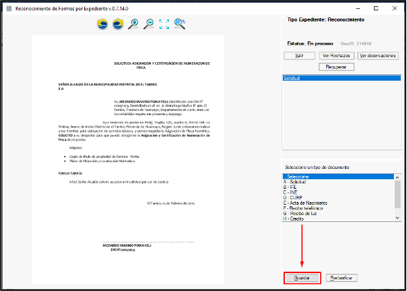 Este botón es para indicar que se proceda a validar y guardar el expediente en el sistema, si todo está correcto el sistema guardar los cambios y se actualiza el estado del expediente. En caso de haber algún otro expediente pendiente para realizar el reconocimiento de formas el sistema lo muestra automáticamente. Si ocurrió algún error al validar el expediente se podrá capturar motivo y rechazar expediente.
