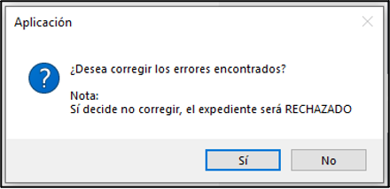 Luego de aceptar aparece el siguiente mensaje que permite elegir si quiere corregir los errores presentados o rechazar el expediente.