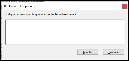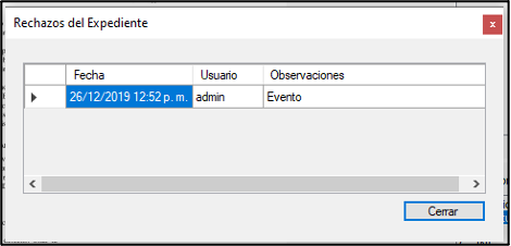 Al seleccionar la opción Ver Rechazos se muestra una ventana con todos los rechazos de ese expediente que se hayan realizado en procesos anteriores o en ese mismo.