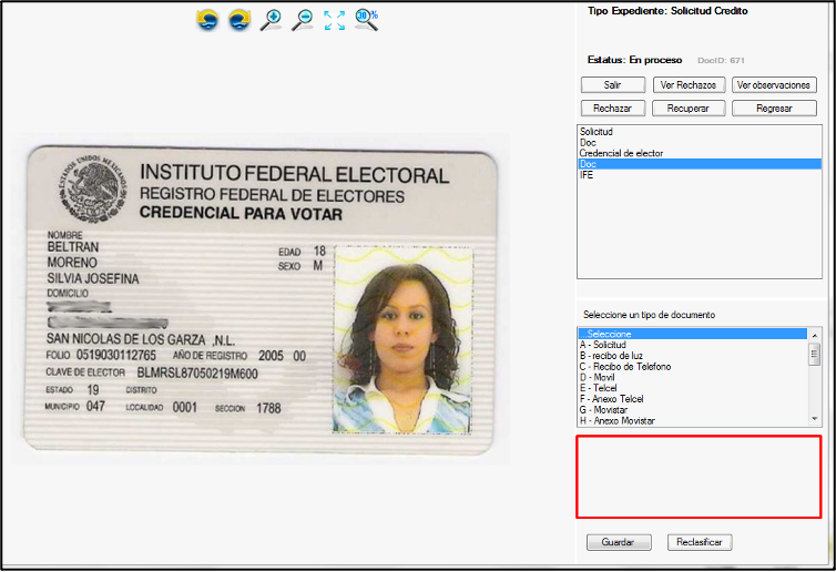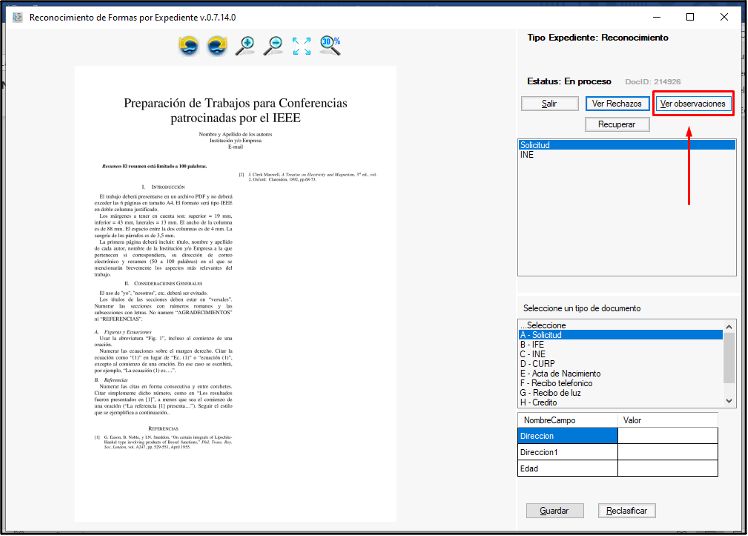 En esta sección se muestra el campo llave y el estatus de ese expediente, debajo de éstas se visualizan tres botones que son Salir, Regresar y Ver Observaciones, así como una lista con los documentos que conforman el expediente, a través de la cual se podrá navegar para realizar el reconocimiento de las formas y debajo se muestran los metadatos, en caso de que apliquen.