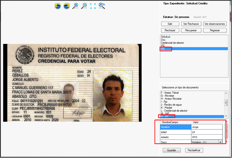 Retipificación del Documento, se hereda el metadato consecutivo de un documento a otro, en este caso de “Documento” a “ IFE”: