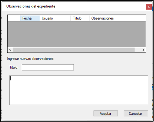 Para agregar una nueva observación se muestra la siguiente ventana, donde puede ver las observaciones anteriores y agregar nuevas.