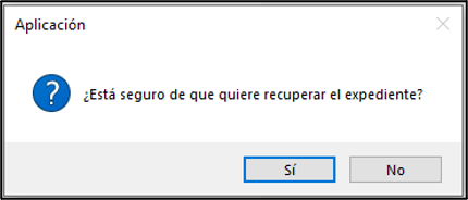 Cuando se requiere recuperar un expediente, seleccionar la opción Recuperar y muestra un mensaje de confirmación.