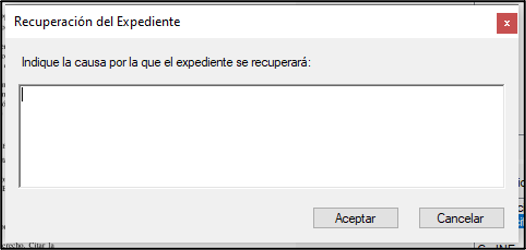 Una vez confirmada la recuperación muestra una pantalla emergente donde se ingresa la causa por la cual el expediente se recupera.