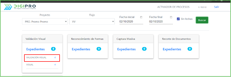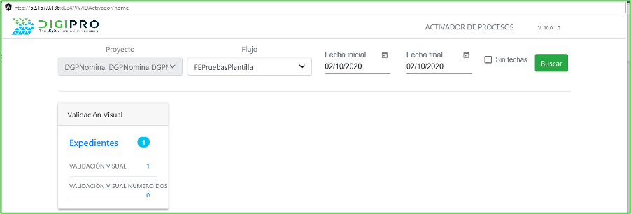 Después de haber dado click en el botón verde nos mostrara nuestro proceso o procesos de validación en el cual nos mostrara cuantos expedientes tenemos para realizar la validación.