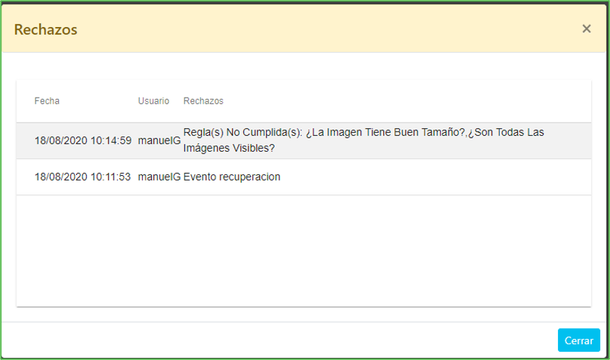 En el apartado de rechazos podremos observar cuales expedientes no cumplieron con las reglas de validación para que los documentos puedan ser observados tendrán que haber sido transitados con el botón de rechazo que se encuentra en el apartado de “Transitos”.