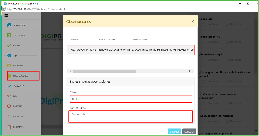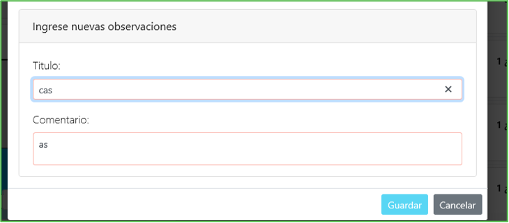 NOTA: Es necesario ingresar más de 5 caracteres para poder guardar una observación tanto en el titulo como en el comentario en caso de no ser así no se le permitirá guardar.