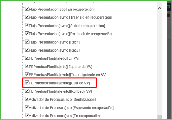 Buscaremos nuestro evento este estará acompañado del nombre de nuestro flujo una ves lo tengamos ubicado le daremos click en el recuadro al dar click se pondrá una palomita por último guardaremos el cambio.