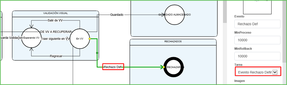 En el flujo sobre nuestro proceso de la validación visual tendremos el evento o lo podremos agregar en el cual la tarea que ocupará será la de salir.