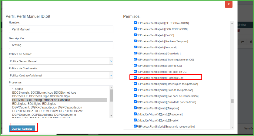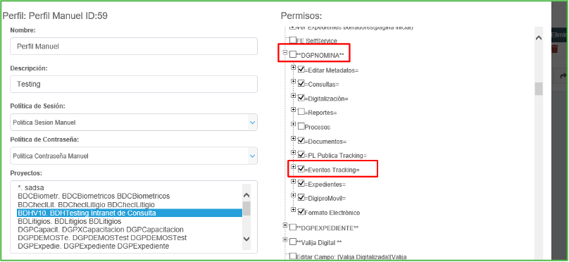 Teniendo nuestro evento agregado a nuestro flujo le daremos permisos entrando en > “administración” en > “perfiles” buscaremos el perfil que tiene nuestro usuario y desplazaremos nuestro > “proyecto” de nuestro proyecto seleccionaremos “=Eventos traking=”