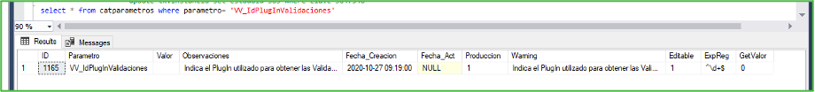 En la tabla “catparametros” se insertará un parámetro el cual es “VV_IdPlugInValidaciones” el valor se quedará vacío, Observaciones se agregará la función que realizara, Producción estará con valor 1, en warning se agregara lo mismo que en observaciones, en editable ira con valor 1, en ExpReg con valor ^\d+$ y en GetValor con 0.