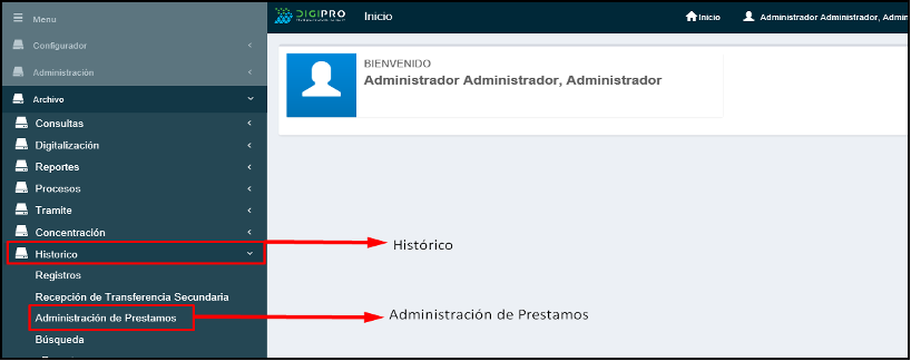 La opción de la Administración de Prestamos en Archivo Histórico, tiene la funcionalidad precisa y tal como está en el archivo de Trámite, con la misma estructura y estados para las solicitudes necesarias.