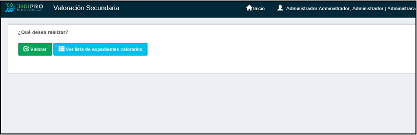 Al seleccionar la opción de Valoración Secundaria, nos muestra las opciones de Valorar y Ver Lista de Expedientes Valorados.