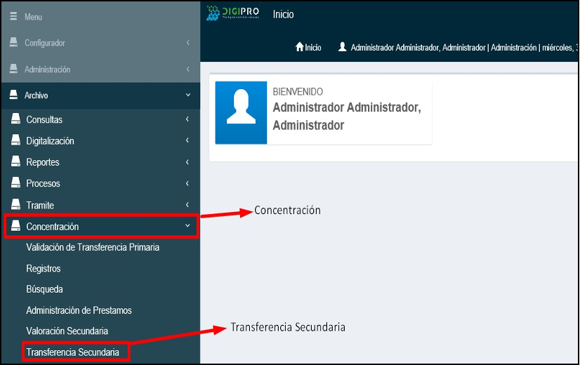 Dentro de histórico para poder ingresar los expedientes que se transfieren del archivo de Concentración, es necesario ingresar a la Recepción de Transferencia Secundaria.